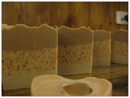 另外用相同的皂液,再加上綠礦泥,綠藻粉,白芷粉作成三層皂,給同事易長痘痘的老公及我自己使用!