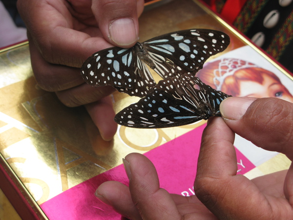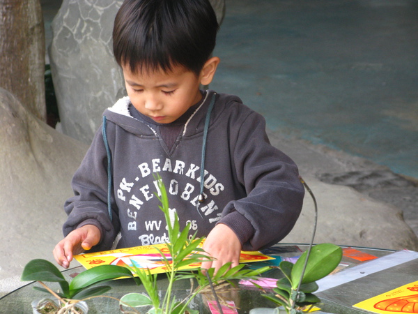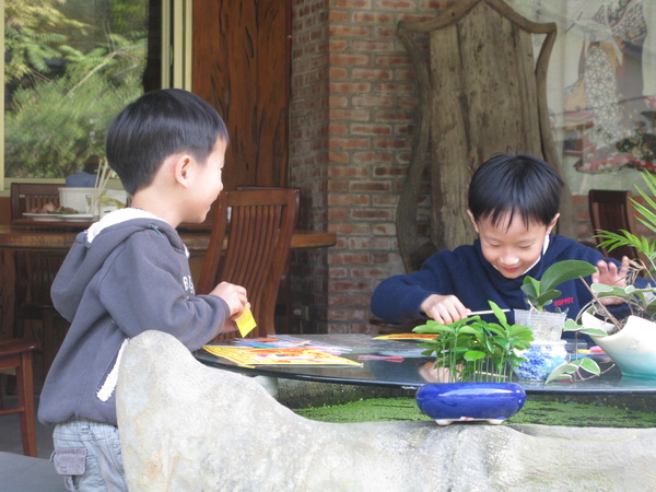 老古餐廳中午用餐,小朋友在玩茂林國家風景區贈送的贈品蝴蝶沙畫