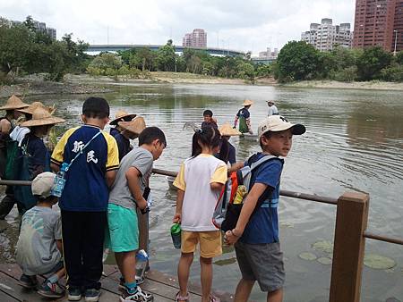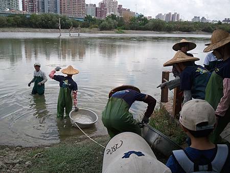 一群大哥哥大姊姊要到湖中除水草(一日體驗營的志工)