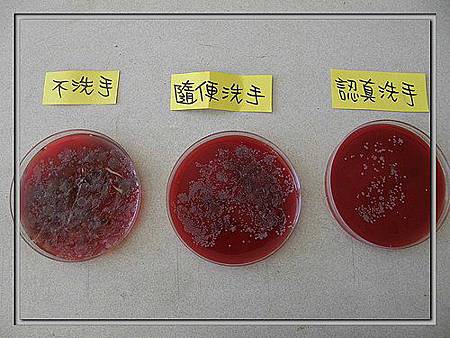 4. 腸病毒肆虐期間,家中有小孩的父母, 想必都很擔心,電視上學校裡不斷的宣導洗手的重要,我們讓小朋友做手部細菌培養.,比較看看認真洗手與隨便洗手時手上細菌量的差異,提高孩子主動洗手的意願。