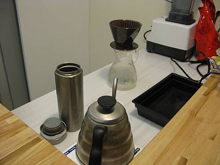 哥哥將明天媽媽沖煮咖啡的器具保溫瓶都準備好了